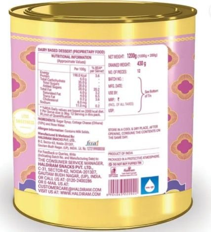 Ingredients: Sugar, Chhena (Milk Solids), Water, Emulsifiers, Flavoring Agents (as per packaging)